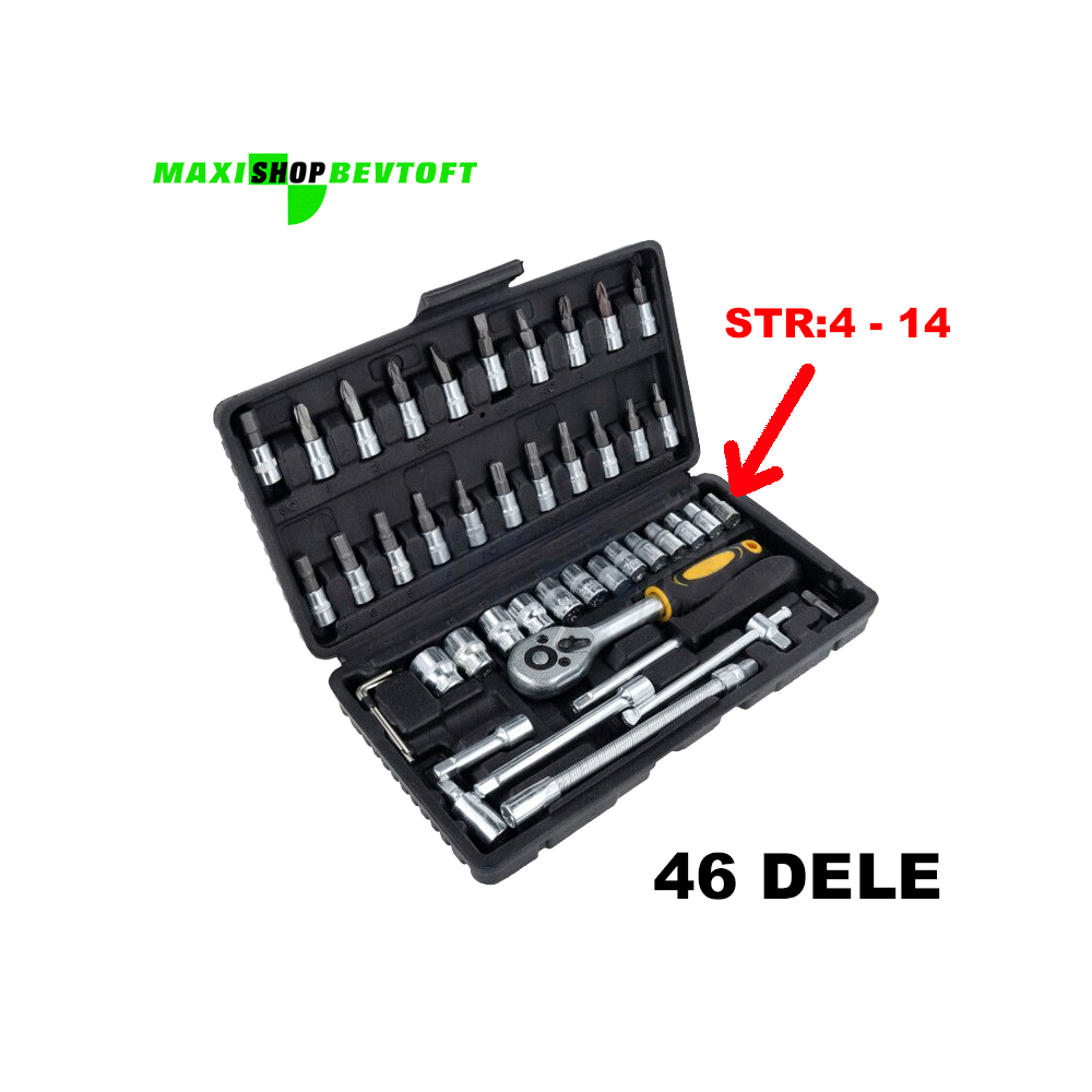 Sættet indeholder et bredt udvalg af toppe, bits og tilbehør, så du kan klare mange forskellige opgaver – lige fra almindelig service og vedligehold til montage og reparation. Typisk indeholder et 46-dels 1/4″ sæt blandt andet: